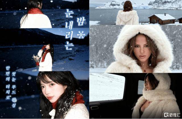 同样是“AI雪景”这个玩法,美图秀秀针对不同市场的审美偏好来调整妆容及效果。东亚市场,AI雪景更突出人物,用雨伞、围巾等元素增加氛围感,风格偏清新, 迎合东亚用户“雪景=浪漫”的认知。而在欧洲市场,“AI雪景”的效果更加偏向斯拉夫风格,背景以宏大的雪山、冰河、汽车、木屋等元素为主,人物妆容也更加自然。